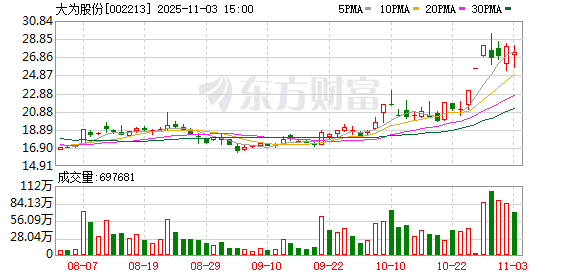 大为股份今日下跌2.21%,全天换手率33.78%,成交额18.93亿元,振幅10.24%。龙虎榜数据显示,机构净卖出2484.92万元,营业部席位合计净卖出2434.87万元。