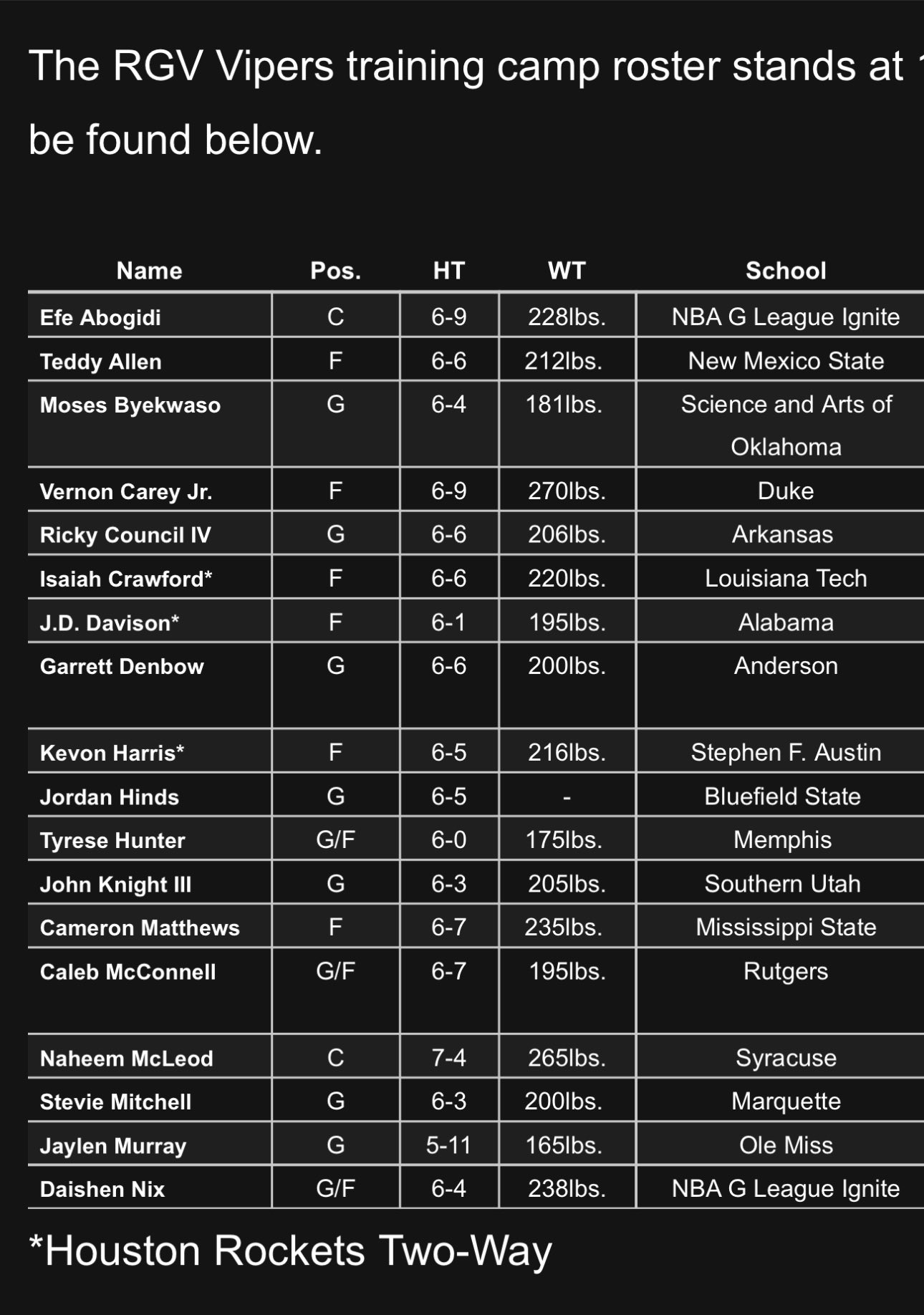 其中,火箭的三名双向合同球员均在列,分别为:JD-戴维森、吉翁-哈里斯与以赛亚-克劳福德。